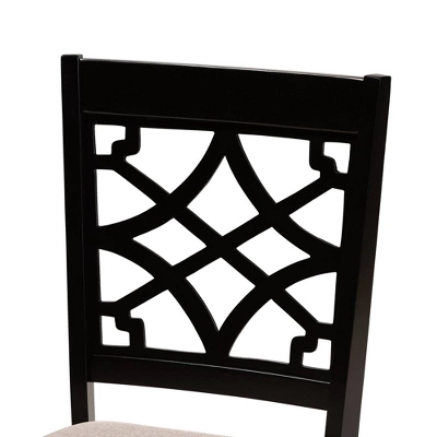 Cultivate an air of elegance in your dining room with the Mael dining set. This dining set is made in Malaysia and is constructed from solid oak wood. Assembly is required and this set includes one table with six chairs, each upholstered in a light fabric that complements the rich espresso brown finish on the wood. Designed with both comfort and style in mind, each chair features a plush foam-padded seat, as well as an exquisite cut-out design on its back. Saber legs add a classic, refined touch. Equally suitable for both chic dinner parties and casual family dinners, the Mael dining set is sure to enhance any dining experience. Table Dimensions: 29.13″ high x 59.06″ wide x 35.43″ deep; Legs: 28.35″ high; Chairs Dimensions: 37.4″ high x 18.7″ wide x 20.3″ deep; Seating dimensions: 18.7″ wide x 15.7″ deep x 17.9″ high (from Floor); Back: 19.7″ high; Legs: 16.9″ high;