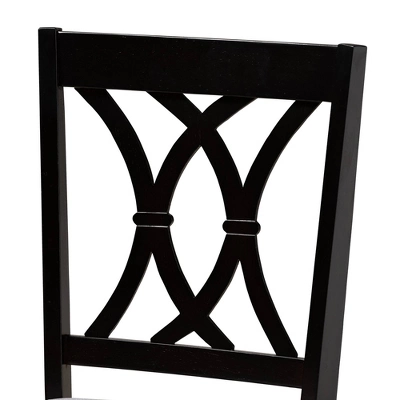 Crafted with the utmost attention to detail, the Reneau 7-piece dining set adds elegance to any dining space. Constructed from solid rubberwood in an espresso finish, this dining set includes one table and four chairs, each upholstered in a light polyester fabric that complements the dark wood finish. Designed to add both comfort and style to your dining space, each chair features a plush foam-padded seat, as well as a stunning cut-out design on its back. Tapered feet add a classic, refined touch. Built for long dinners with family and friends, the Reneau set is sure to enhance any dining experience. The Reneau 7-piece dining set is made in Malaysia and requires assembly. Chair dimensions: 37.4″ High x 17.7″ Wide x 20.5″ Deep; Seating Dimensions: 18.5″ High (from Floor) x 18.5″ Wide x 16.1″ Deep; Back: 18.9″ High; Legs: 16.9″ High