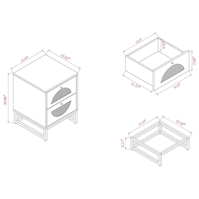 Combining retro design with modern geometry, the Ardon end table brings value to your interior. Made in China, this striking piece combines natural rattan with a sturdy wood and metal frame for a tranquil, carefree display that exudes warmth. Two drawers provide secure storage space for household essentials while reserving the tabletop for daily use. Requiring assembly, the drawers of the Ardon feature natural rattan accents for a charming, exotic touch. With a crisp and clean silhouette, the Ardon adds character to any shared space. Overall Dimensions: 20.90″ High x 15.70″ Wide x 15.70″ Deep; Legs: 5.10″ High; Drawer Dimensions: 13.50″ Wide x 11.77″ Deep x 4.52″ High;