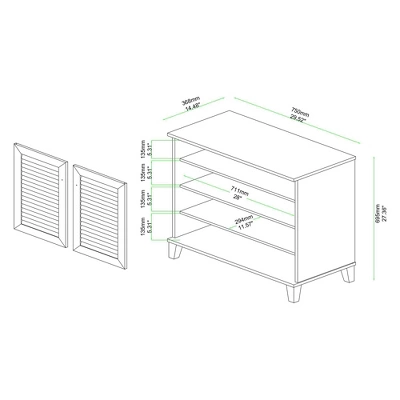 Store your shoes on the sly with the Coolidge shoe cabinet. Made in Malaysia, this shoe cabinet is constructed from sturdy wood. Four shelves located behind the doors provide storage space for approximately 12 pairs of shoes, depending on size. Requiring assembly, the Coolidge features slatted wood doors to enable air circulation and disperse odors. Tapered legs raise the cabinet to an ergonomic height, making the Coolidge shoe cabinet a sophisticated solution to your storage needs. Overall Dimensions: 27.40″ High x 29.50″ Wide x 14.50″ Deep; Shelf Dimensions: 28.00″Wide x 11.60″Deep x 5.30″ High; Legs: 3.50″ High;