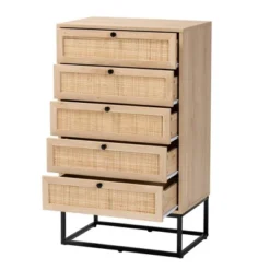 Elsbeth Wood And Natural Rattan 5 Drawer Storage Cabinet Oak Brown/Natural Brown – Baxton Studio