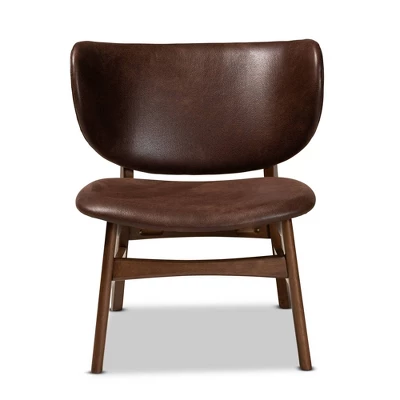 Add a mid-century touch to your interior with the expressive design of the Marcos accent chair. Made in Malaysia, this chair is constructed from walnut brown finished wood that exudes visual warmth. Its curved backrest and seat are padded with plush foam and upholstered in sleek faux leather effect fabric for superb comfort in any public or private space. Requiring assembly, the Marcos utilizes angled legs for stable support. With smooth curves and a visually stunning silhouette, the Marcos accent chair expertly blends style and comfort. Dimensions: 28.30″ High x 24.40 ” Wide x 26.80″ Deep; Seating Area Dimensions: 16.10″ High x 22.04″ Wide x 19.70″ Deep; Back: 12.20″ High; Legs: 15.00″ High;