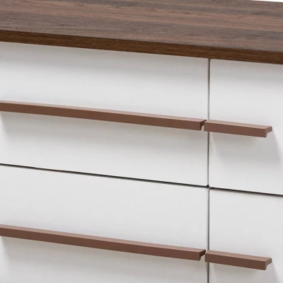 With its sleek design and exceptional craftsmanship, the Mette TV stand is a stylish addition to any living room. Constructed from engineered wood, the Mette showcases a two-tone white and walnut brown finish for a cool, contemporary feel. Two open shelves provide space to place DVD players, game consoles, and more. One circular cut-out behind the shelves enables easy concealment of cables and wires. Additional storage space is provided by four spacious drawers. Elongated PVC handles complete the clean, streamlined look of this TV stand. The Mette TV stand is made in Malaysia and requires assembly.