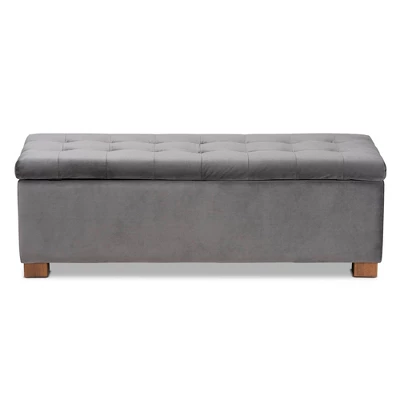 Perfect as a bed end bench for your bedroom or as an accent piece in your living space, the Roanoke storage bench combines handy seating and storage in a stylish way. Constructed from rubberwood, the bench features a cushioned seat upholstered in a soft velvet fabric that adds a dose of glamour to your space. The elegant grid-tufted top opens to reveal ample storage space, while walnut brown legs create a strong foundation. The Roanoke storage bench is made in Malaysia and requires leg assembly. Dimensions: 15.35″ High x 46.06″ Wide x 16.73″ Deep; Legs: 1.97″ High;