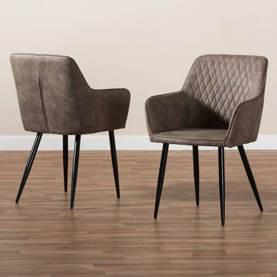 A retro silhouette is paired with sleek leather to give the Belen dining chair a cool, contemporary look. This metal chair is upholstered in a gray and brown imitation leather fabric that feels exceptionally smooth to the touch. Its slanted back and foam padding provide ample dining comfort. Quilting on the inner back and arms adds a tailored touch, while black splayed legs add a hint of mid-century appeal. The Belen dining chair is made in China and requires assembly. Dimensions: 34.25″ High x 23.62″ Wide x 18.11″ Deep; Seating Dimensions: 22.83″ Wide x 16.93″ Deep x 18.11″ High (from Floor); Height (from Floor to Top of Arms): 25.98″ High; Back: 16.14″ High; Legs: 16.54″ High;