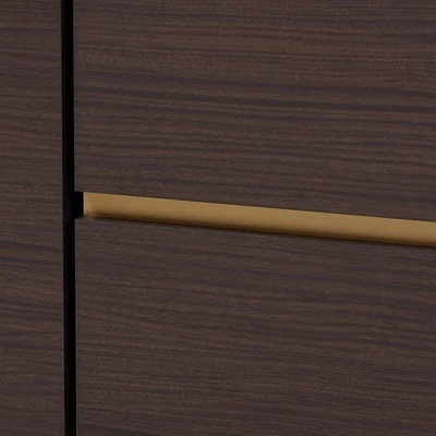 The sleek, modern flair of the Walker TV stand creates a stunning focal point in your living room. Made in Malaysia, the Walker radiates rich wood tones with its dark brown finished frame. Two open shelves conveniently organize media devices, while two large shelves behind the doors offer secure storage space. Requiring assembly, the Walker features a touch of gold, as well as a faux marble top, for luxurious accents steeped in modern glamour. A convenient cord management hole on the back panel allows for easy setup. With its radiant design and flexible convenience, the Walker TV stand is a superb addition to any space. Dimensions: 18.9″ High x 63″ Wide x 15.75″ Deep; Top Shelf: 6.5″ High x 23.6″ Wide x 14″ Deep; Bottom Shelf: 7″ High x 23.6″ Wide x 14″ Deep; Left Compartment Behind Door: 14.1″ High x 18.1″ Wide x 13.4″ Deep; Right Compartment Behind Door: 14.1″ High x 18.9″ Wide x 13.4″ Deep;