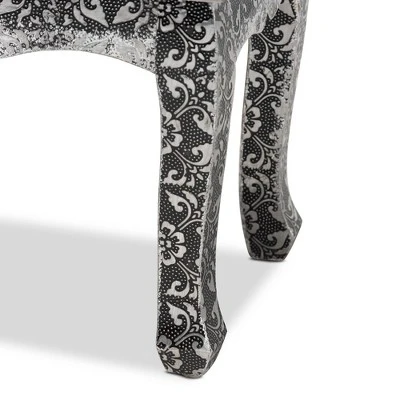 Introduce a bold statement of modern glamour to your interior with the extraordinary Wycliff end table. Made in China, this stunning piece is comprised of a solid wood frame adorned with an embossed metal trim featuring a floral pattern. Two drawers offer space to organize household essentials, while mirrored glass panels enrich the charisma of the piece. The Wycliff will arrive fully assembled and features cabriole legs for excellent stability and support in elegant style. Faux crystal drawer knobs lend a graceful touch, making the Wycliff end table a marvelous addition to any layout. Overall Dimensions: 27.80″ High x 15.70″ Wide x 11.80″ Deep; Drawer(Each): 11.00″ Wide x 9.40″ Deep x 6.70″ High; Legs: 11.80″ High;